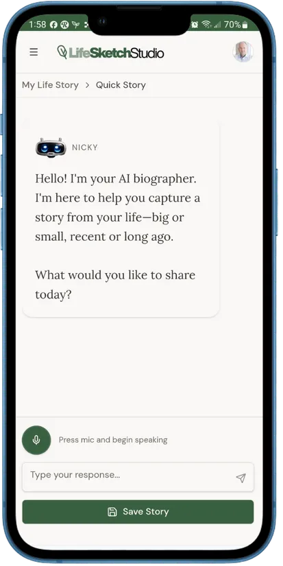 When you join LifeSketch, you don’t sit down to write—you sit down to talk. Our end-to-end authoring tool system listens to your stories, converses, captures every detail, and shapes your stories into well-crafted, page-turning chapters, written in your voice. No prompts. No blank pages. Just conversation … and a finished book.